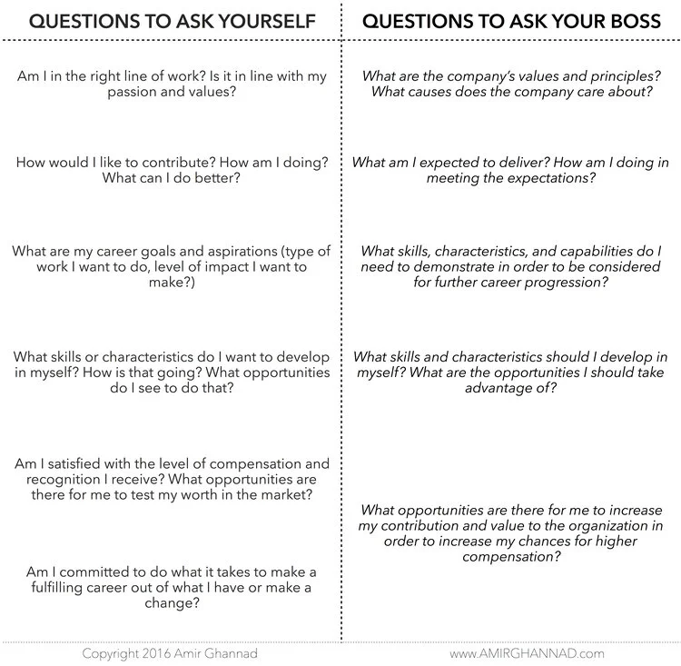 Ask yourself these self-reflection questions and periodically get your boss’s perspective on the following questions, listed below:
