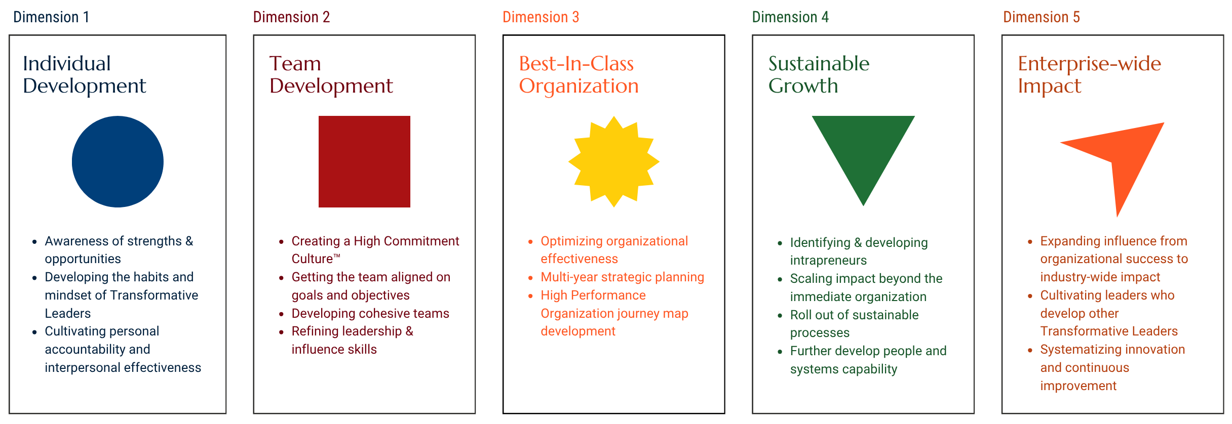 Our Framework is designed to develop Transformative Leadership capability at all levels of the organization, cultivate collaborative partnerships among team members, create a unifying vision, and guide the process of installing sustainable systems, processes, and behaviors that continue to scale. Effective in any situation, industry, location, or size of organization, the ultimate aim of the framework is to create extraordinary cultures that deliver breakthrough results and unprecedented fulfillment, no matter the circumstance.